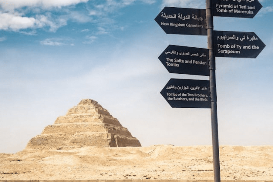 - Grand Egyptian Museum beside the pyramids and Saqqara’s Step Pyramid of Djoser.