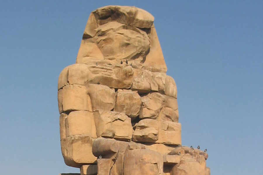 These two colossal statues of Pharaoh Amenhotep III, built 3,400 years ago, once guarded his funerary temple. Each statue shows the pharaoh seated, gazing toward the rising sun, with carvings of his mother Queen Mutemwiya and his wife Queen Tiy.