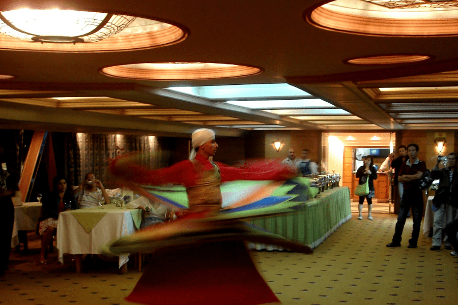 Guests enjoy live Egyptian music, an enchanting belly dancer, and the colorful Tanoura (whirling dervish) show during the cruise.