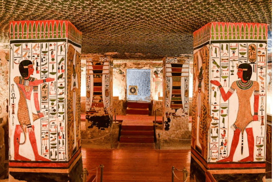 The tombs in this valley are ornamented with exquisite paintings and inscriptions that show the queens' roles in both the royal family and religious ceremonies, marking their importance in Egyptian society.