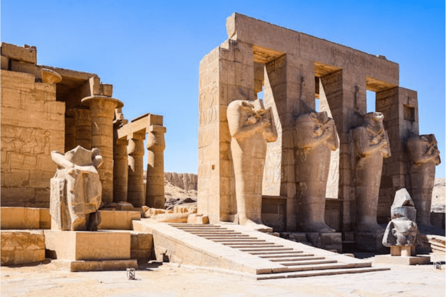 The Ramesseum served as the mortuary temple of Ramses II. Although less well-preserved than his temples at Karnak and Abu Simbel, the site still displays colossal statues, monumental pillars, and reliefs that depict the king’s military achievements and divine connections.