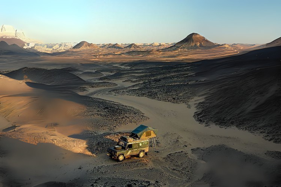 The Black Desert is a dramatic expanse of dark volcanic hills rising from the sand — a natural masterpiece created by ancient eruptions. The contrast of black peaks against golden dunes makes this landscape surreal and deeply romantic, especially at sunset. It’s a favorite spot for honeymoon photos and quiet moments surrounded by desert silence.