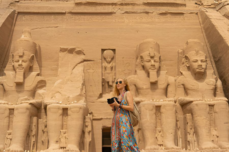 Empezamos nuestro cuarto día del viaje de 8 días en Egipto temprano, cuando tomamos las cajas del desayuno del crucero y salimos a Abu Simbel. Construido en la orilla oeste del río Nilo, el sitio de Abu Simbel es uno de los sitios antiguos más reconocibles de Egipto. Contiene dos templos, tallados en la ladera de una montaña, que fueron construidos por el faraón Ramsés II (1303-1213 a. C.), también conocido como Ramsés el Grande. El más grande de los dos templos contiene cuatro estatuas colosales de un Ramsés II sentado en su entrada, cada una de aproximadamente 21 metros de altura. Además del templo principal, Abu Simbel tiene un segundo templo, más pequeño, que probablemente fue construido para la reina Nefertari. Su frente incluye dos estatuas de la reina y cuatro del faraón, cada una de aproximadamente 10 metros de altura. Cada una está colocada entre contrafuertes tallados con jeroglíficos.