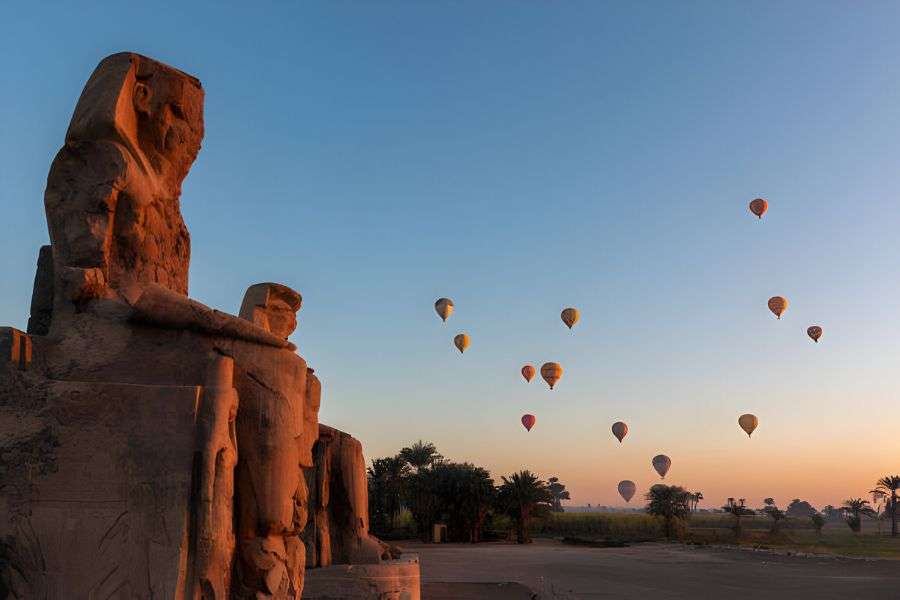 Continuamos nuestro tercer día en el recorrido a El Cairo y Luxor con la visita de los Colosos de Memnon. Dos colosales estatuas sedentes del faraón Amenhotep III, que una vez habrían flanqueado la entrada del Templo Mortuorio del rey. Vamos a disfrutar del almuerzo en un restaurante y luego te llevaremos a tu hotel en Luxor.