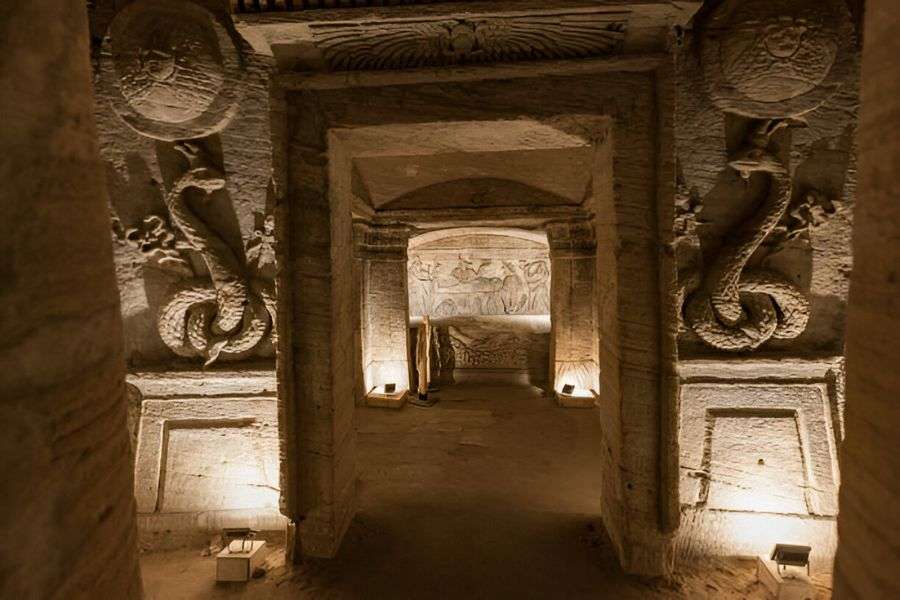 Disfruta del desayuno en el hotel, y continuamos nuestra tour a El Cairo con la visita de Alejandría. Nuestro guía te acompañará desde tu hotel en El Cairo en un vehículo privado con aire acondicionado y dirigimos a Alejandría. Empezamos el día con la visita de las Catacumbas, son uno de los sitios arqueológicos históricos más importantes de la zona de Kom El-Shoqafa en Alejandría y se considera una de las siete maravillas del mundo medieval.