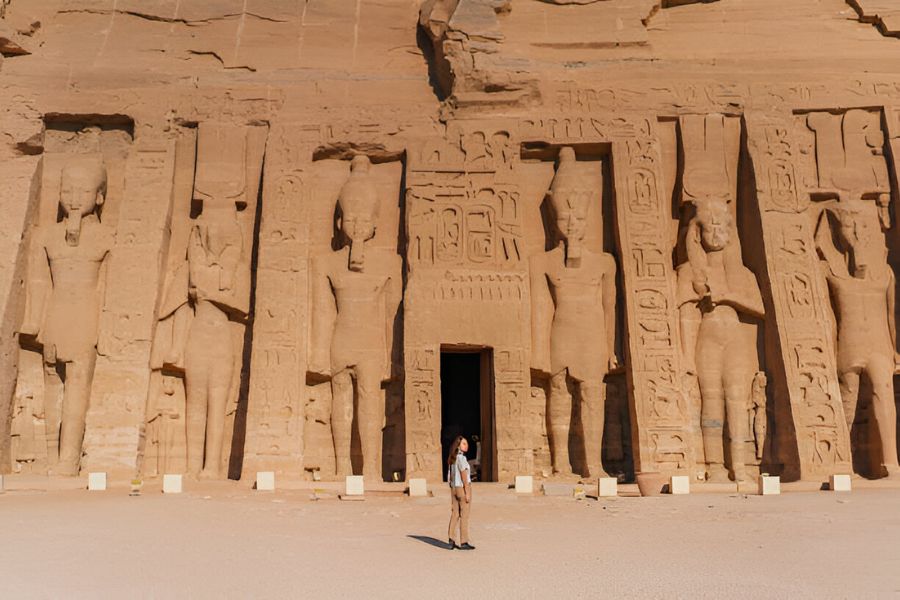 En el tercer día del viaje de 8 días en Egipto, recibimos las cajas del desayuno del hotel para visitar al Complejo de Abu Simbel. Los templos fueron tallados en la roca y presentan intrincados grabados y enormes estatuas de faraones y dioses. El templo más grande de Abu Simbel se llama el Gran Templo y tiene 30 metros de altura, mientras que el templo más pequeño se llama Templo de Hathor y está dedicado a la esposa de Ramsés, Nefertari.