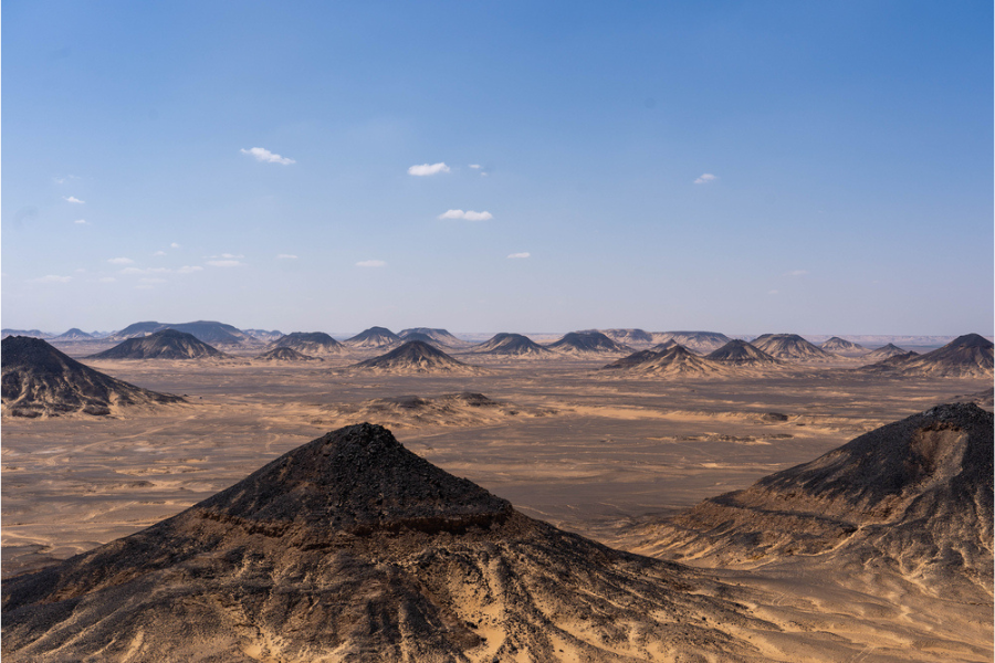 Just north of Bahariya lies the Black Desert, named for its dark volcanic hills coated in black basalt. Formed millions of years ago by ancient volcanic activity, the area’s contrasting colors — black peaks against golden sands — create a surreal and dramatic landscape that photographers adore.
