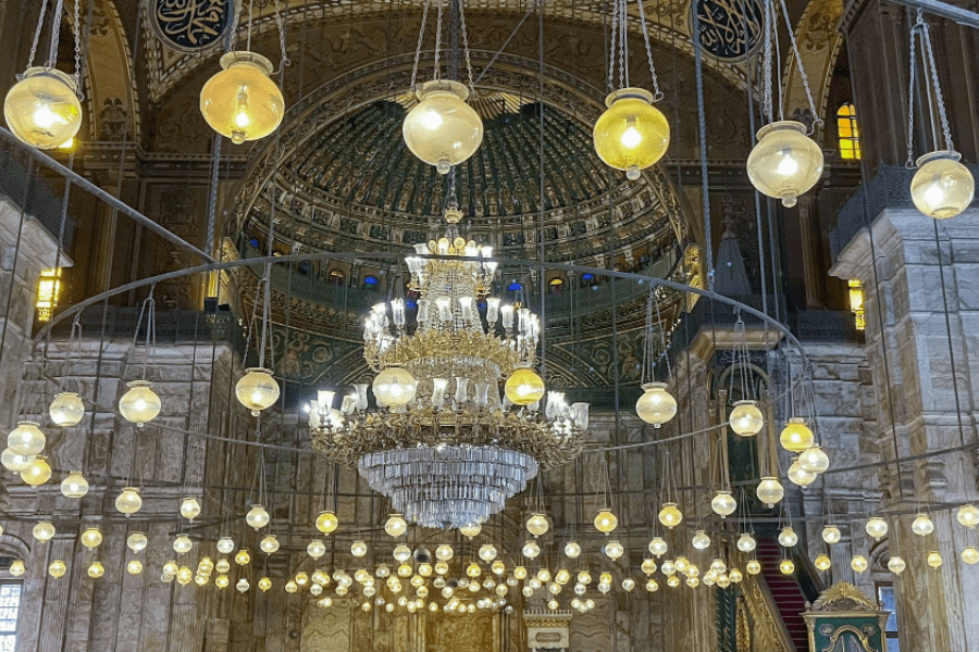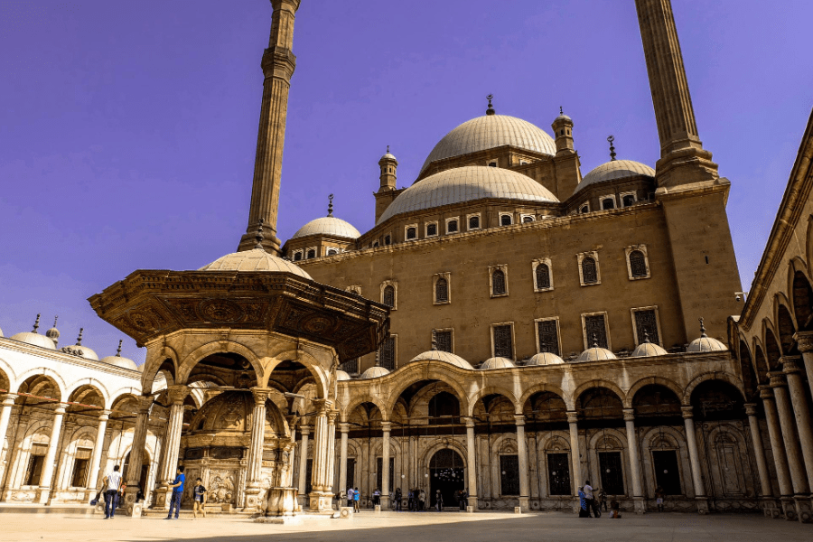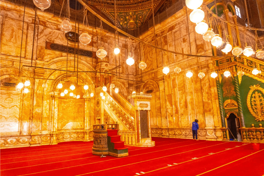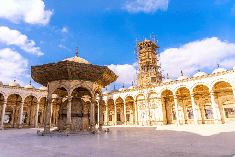 Located within the citadel, the grand Mohamed Ali Mosque (Alabaster Mosque) represents 19th-century Ottoman architecture at its finest. Its white domes and twin minarets dominate Cairo’s skyline — a magnificent example of Egypt’s Islamic art and heritage.