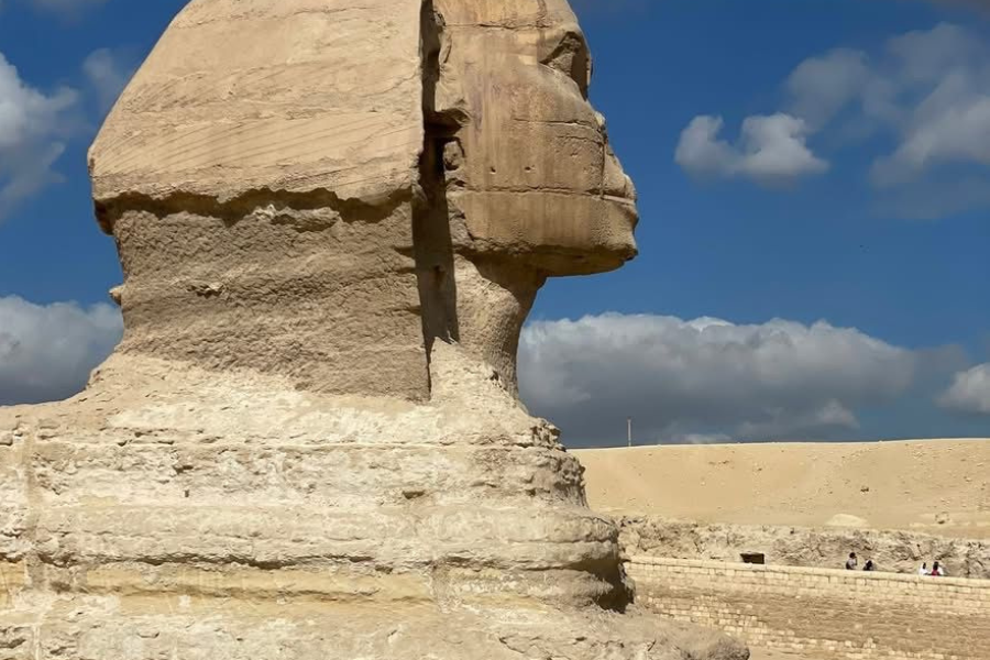 Facing the desert horizon, the Sphinx stands silent and powerful. Its lion’s body and human face seem to guard the entire plateau, adding mystery to the landscape.